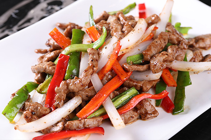 4)加入熟牛肉絲  、黑胡椒調(diào)味料,一起炒拌均勻出鍋。